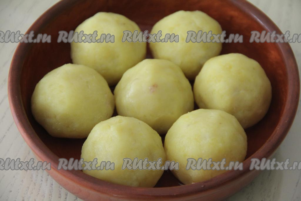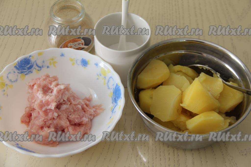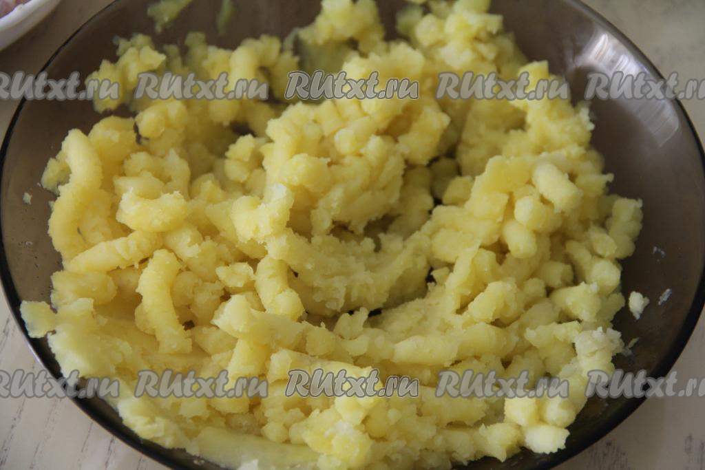 Картошку измельчить в пюре с помощью толкушки, дать немного остыть.