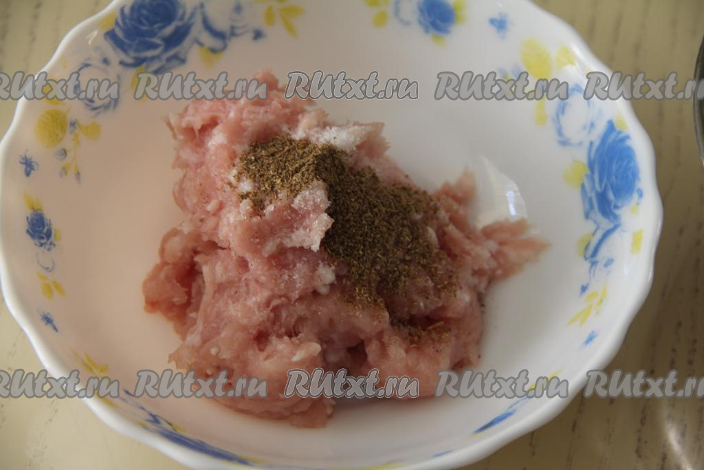 Фарш переложить в глубокую тарелку, посолить, добавить любимые специи, тщательно перемешать.