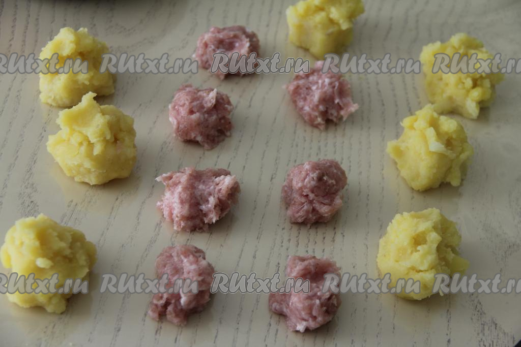 Разделить фарш и картофельное пюре на 7 равных частей (то есть мы будет формировать 7 картофельных шариков с начинкой). Скатать каждую часть фарша в шарик.