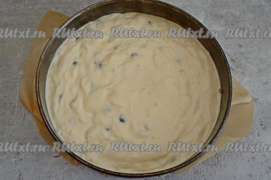 Дно разъёмной формы для выпечки (я взяла форму диаметром 23 сантиметра) застелить пекарской бумагой, бока формы смазать растительным маслом. Выложить тесто в подготовленную форму, разровнять и поставить в духовку, разогретую до 180 градусов.