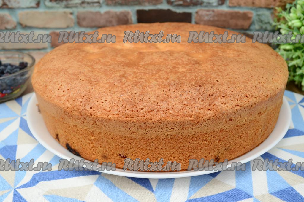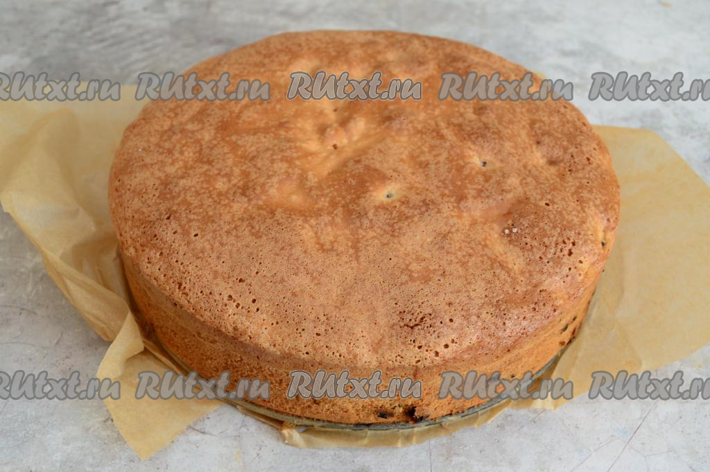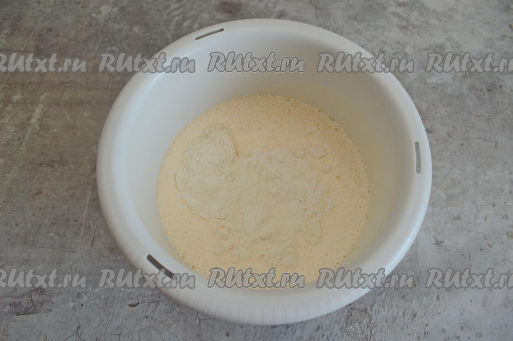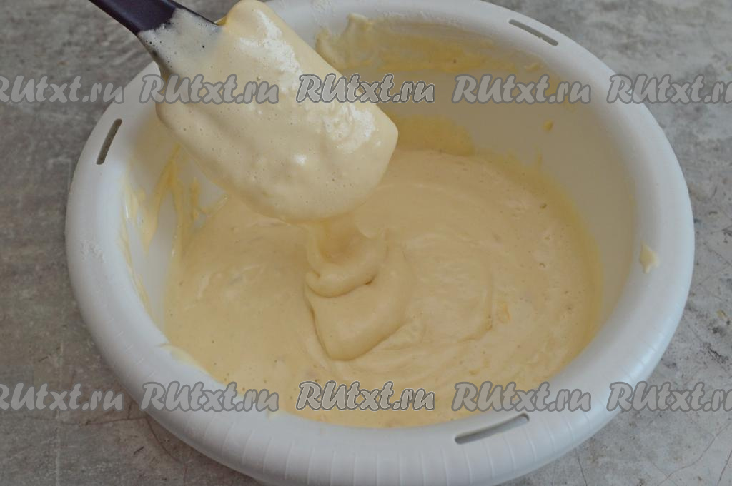 К яйцам, взбитым с сахаром, всыпать разрыхлитель и половину просеянной муки, перемешать лопаткой (или столовой ложкой), полностью вмешивая муку движениями лопатки (или ложки) снизу вверх. Затем добавлять просеянную муку по столовой ложке, каждый раз вмешивая её в тесто.