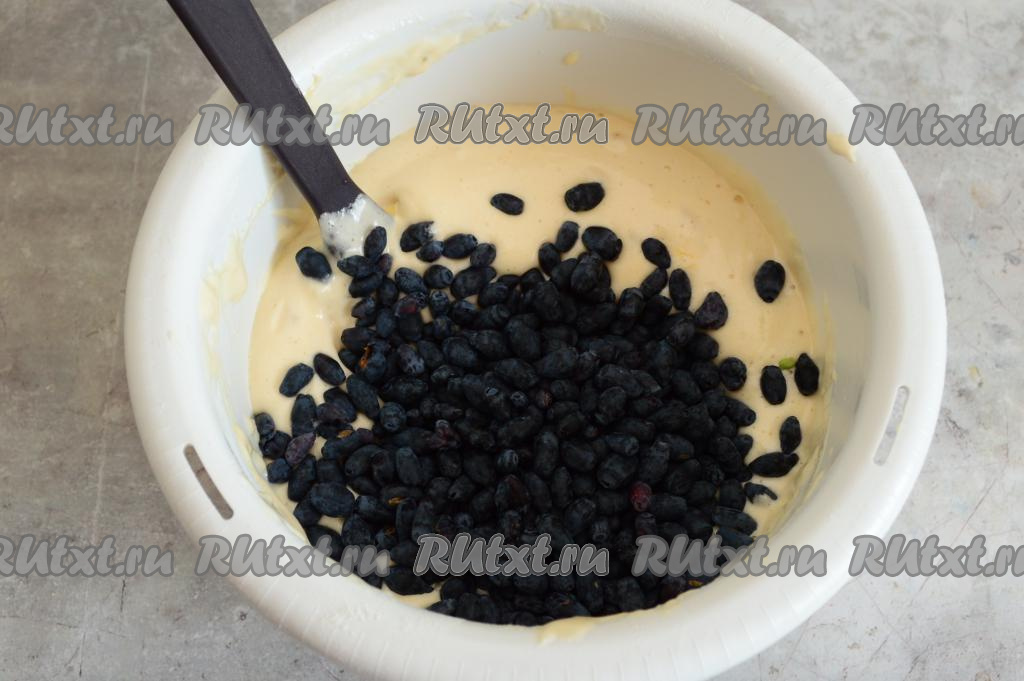 Обсохшую жимолость всыпать в миску с тестом. Аккуратно вмешать ягоды в тесто.
