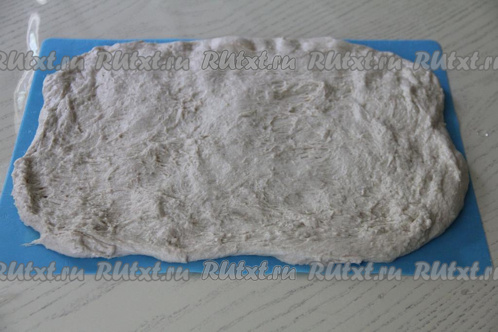 Поставить тесто для чиабатты в тёплое место, прикрыв миску полотенцем, на 1,5 часа. Через каждые 30 минут растягивать тесто в прямоугольный пласт, затем складывать длинные края пласта теста к центру, после этого короткие края получившегося прямоугольника подворачивать к центру, снова класть в миску, накрывать полотенцем.