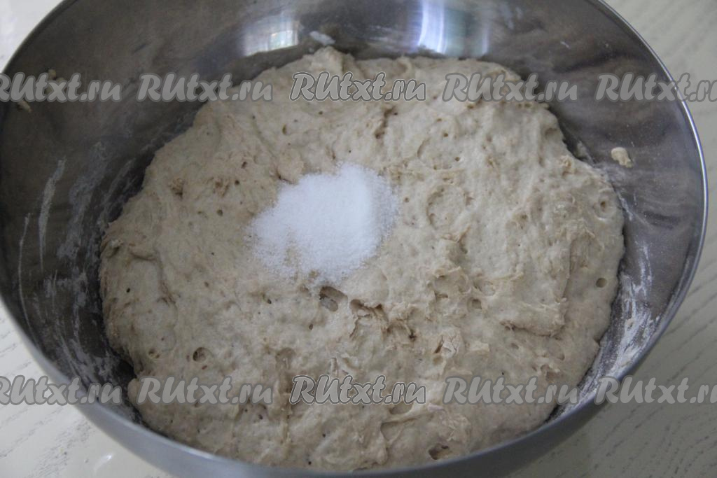 Затем добавить соль и хорошо вымесить тесто руками. Для того чтобы тесто меньше липло к рукам, можно слегка смазать руки растительным маслом.
