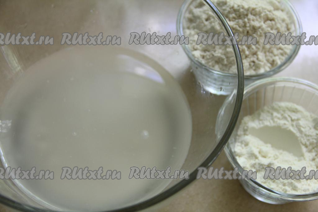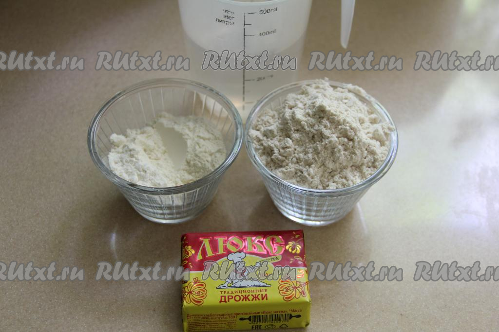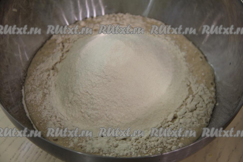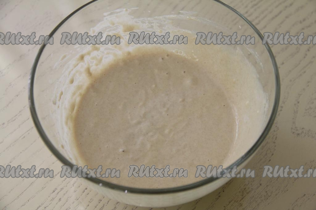 В воду, смешанную с дрожжами, всыпать 100 грамм цельнозерновой муки и 50 грамм пшеничной муки, перемешать опару венчиком и оставить в тёплом месте на 45 минут.