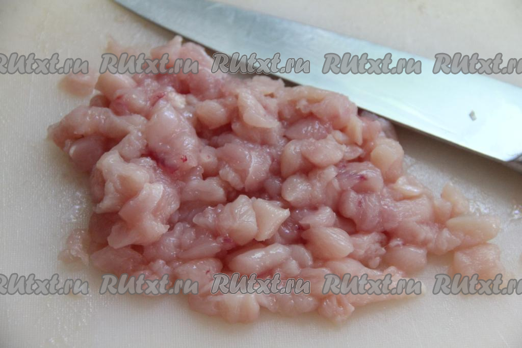 Куриное филе нарезать на мелкие кусочки, выложить в миску.