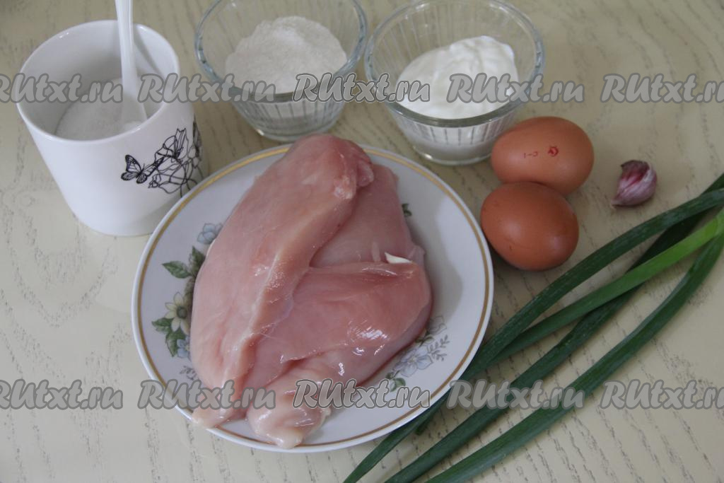 Подготовить продукты. Куриное филе вымыть, обсушить. Зелень (у меня - зелёный лук), если будете использовать, вымыть, немного обсушить. Для формирования котлет можно взять сметану жирностью 15-20% или майонез.