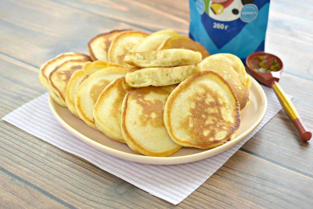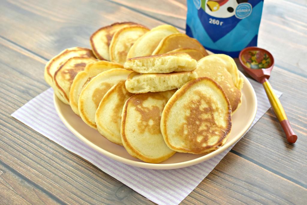 Жарим оладьи до румяности с двух сторон (примерно по 2 минуты с каждой стороны), затем перекладываем на тарелку. Постепенно жарим все воздушные оладушки (у меня получилось 14 штук). Кстати, тесто в миске в процессе жарки оладий перемешивать не нужно.
