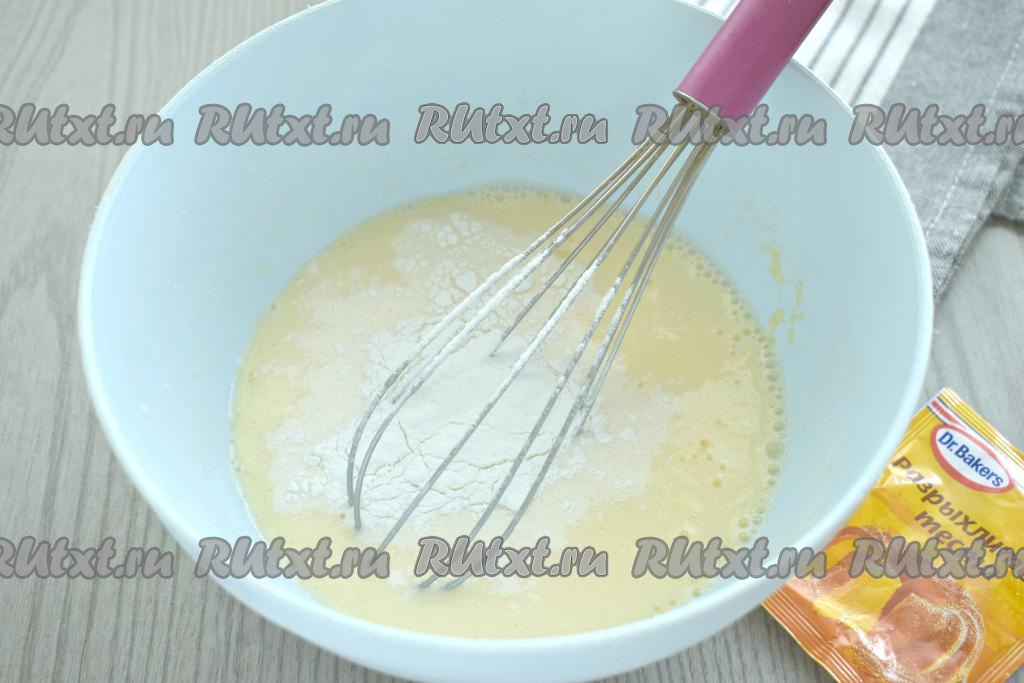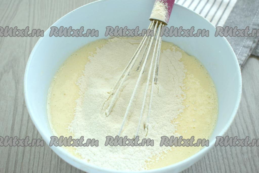 В получившуюся яично-сахарную смесь вливаем кефир комнатной температуры, хорошо перемешиваем венчиком.