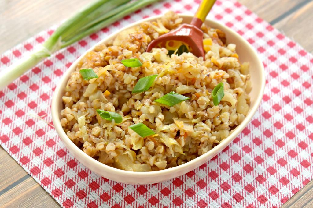 Сочную, вкусную гречку с капустой раскладываем со сковороды по тарелкам и подаём к столу в качестве гарнира к мясу, курице или в качестве самостоятельного блюда в период Поста.