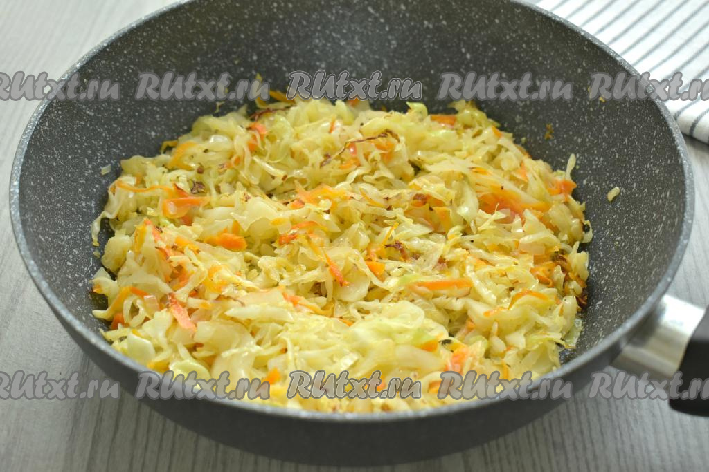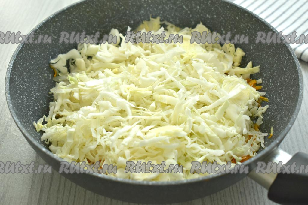 К обжаренным овощам выкладываем капусту, нарезанную на тонкие полоски, перемешиваем, вливаем 50 миллилитров тёплой воды.