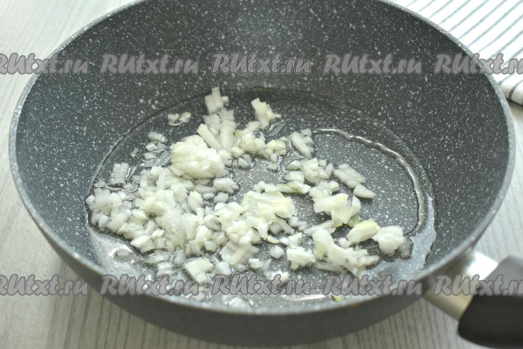Очищаем морковку и лук. В сковороде с высокими бортиками разогреваем растительное масло, после этого выкладываем лук, нарезанный на небольшие кубики, и обжариваем его на среднем огне до прозрачности (минуты 3), иногда перемешивая.