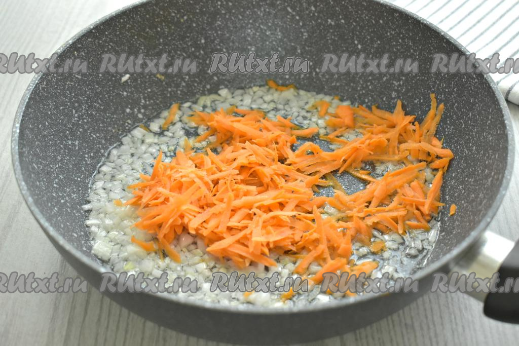 Затем выкладываем морковку, натёртую на крупной тёрке, перемешиваем и обжариваем овощи, периодически помешивая, 4-5 минут (морковь должна стать достаточно мягкой).