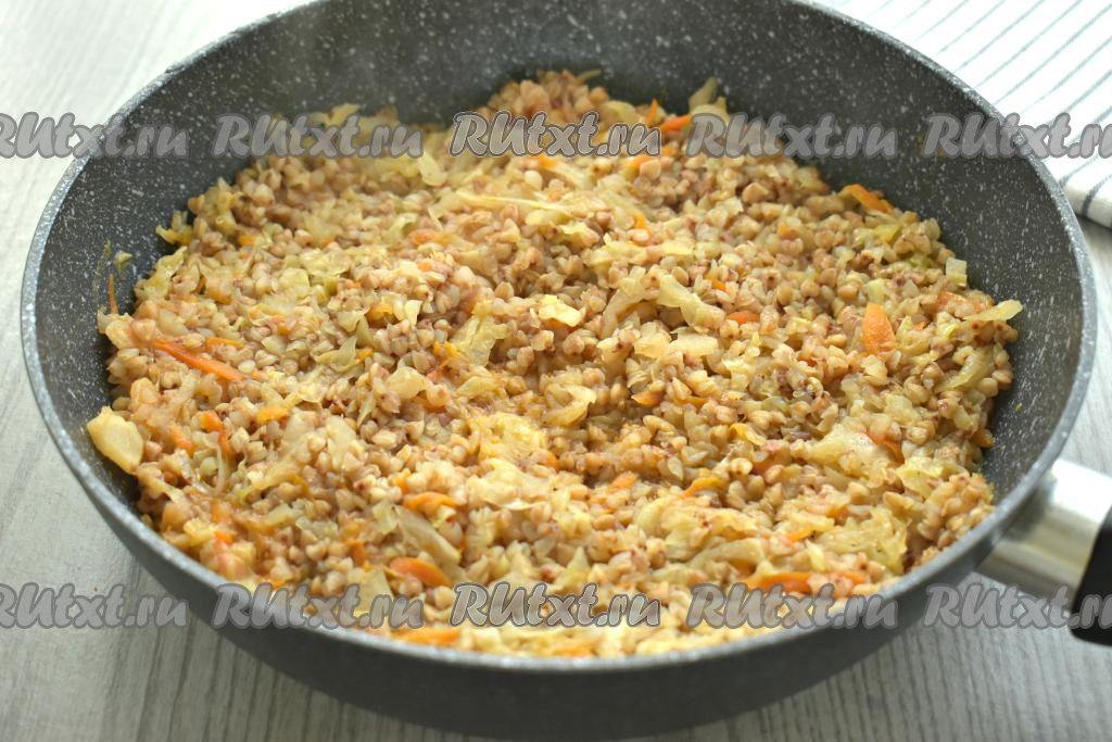 Снова убавляем до минимума огонь и готовим гречневую кашу с капустой под крышкой 5-7 минут.