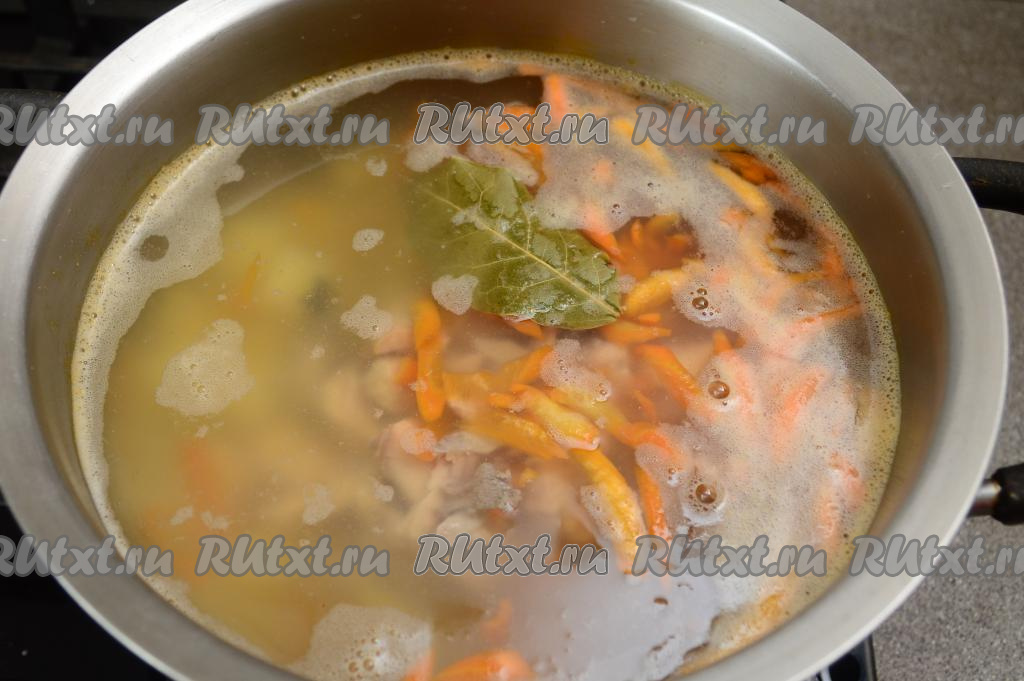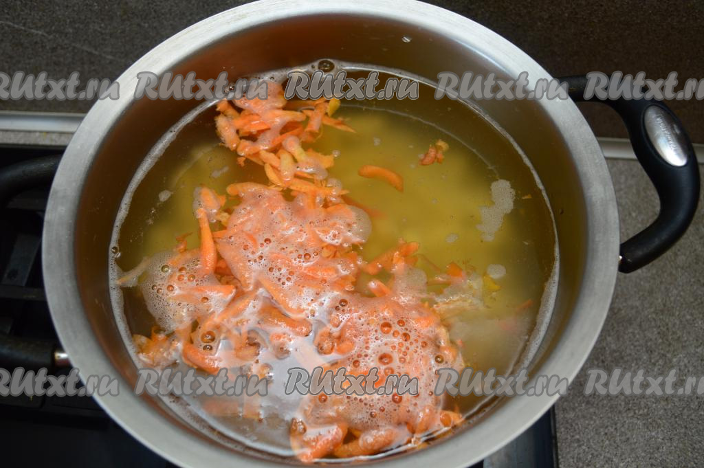 Сразу же добавляем в кастрюлю очищенную и натёртую на крупной тёрке морковку. Доводим воду с рисом и овощами до кипения, варим суп на небольшом огне 15-20 минут (и овощи, и рис должны стать достаточно мягкими, они должны практически полностью свариться).