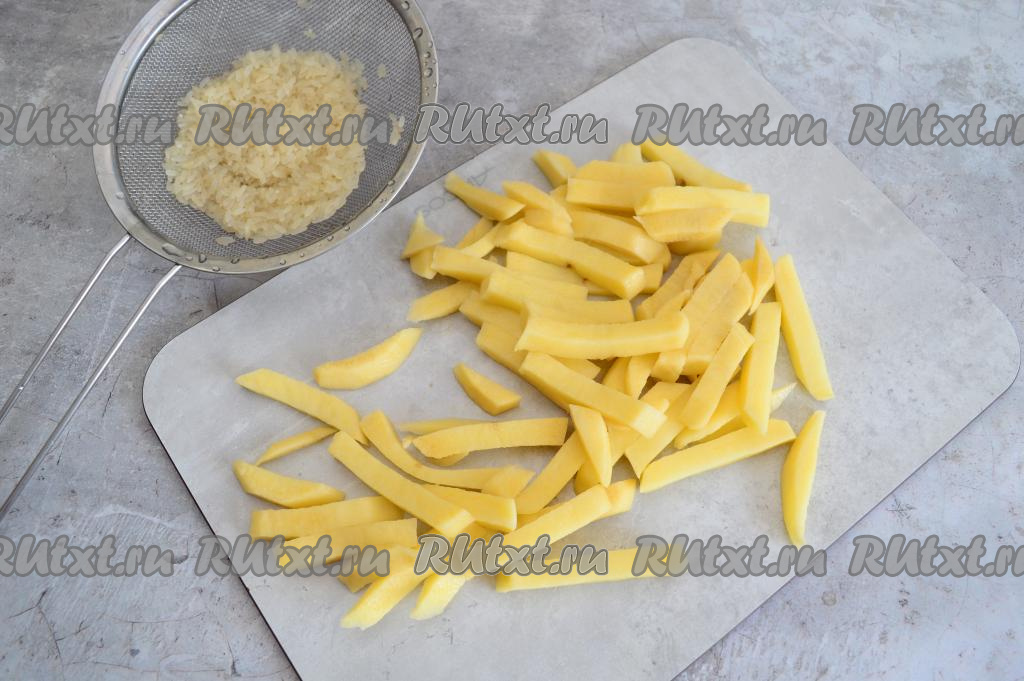В кастрюлю наливаем 2 литра воды, ставим на огонь. Пока вода закипает, выкладываем в сито рис и тщательно промываем его под проточной водой, оставляем на пару минут, чтобы с риса стекла лишняя жидкость. Картошку очищаем и нарезаем на брусочки. В кастрюлю с закипевшей водой выкладываем картошку с рисом.