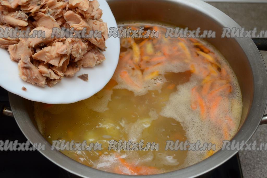После того как рис и овощи будут практически готовы, выкладываем в суп консервированную горбушу и лавровый лист, доводим до кипения и варим минуты 3.