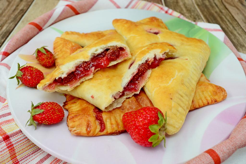 Вкусные, аппетитные пирожки из слоёного теста с нежной, сочной начинкой из клубники можно есть и в горячем, и в остывшем виде.
