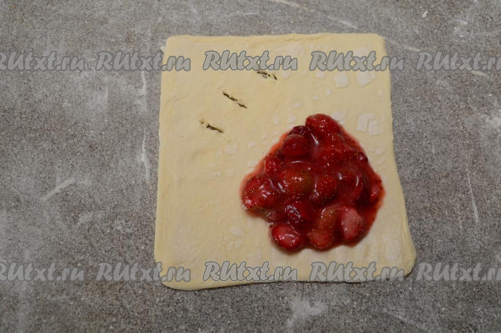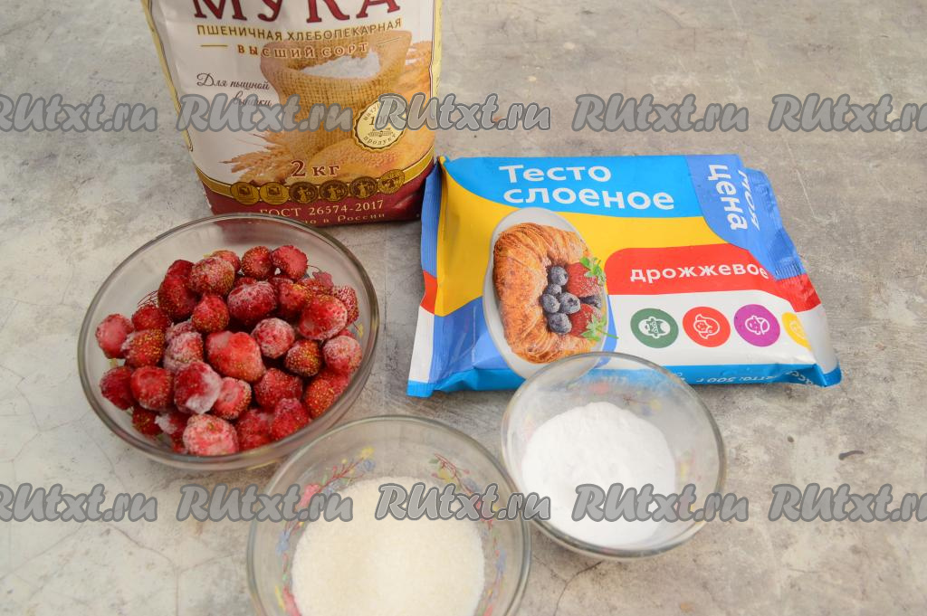 Я использовала дрожжевое слоёное тесто и замороженную клубнику.