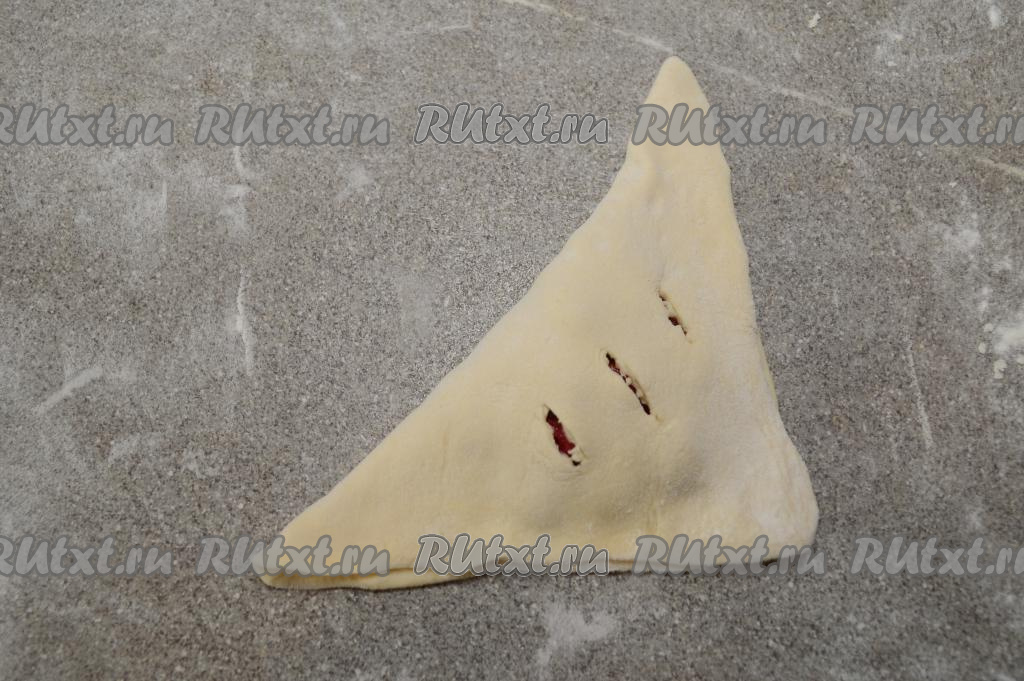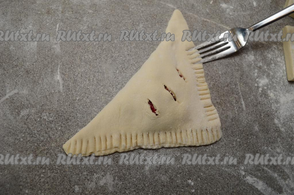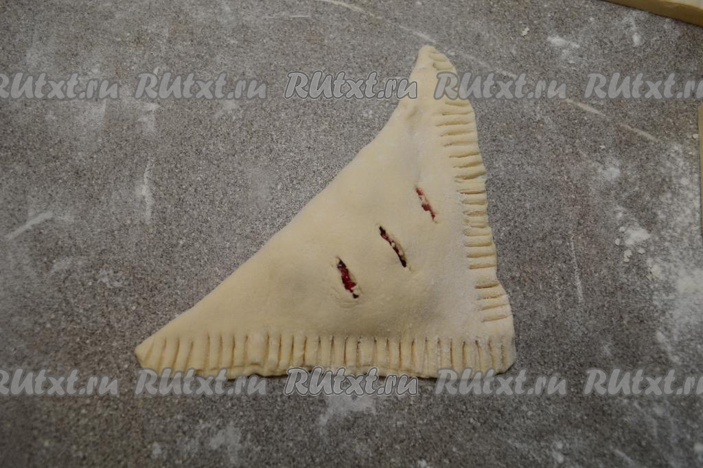 Накрыть начинку стороной с надрезами. Должен получиться аккуратный пирожок треугольной формы.