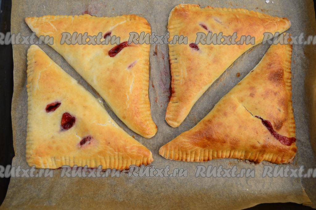 Готовые слоёные пирожки должны стать аппетитного золотистого оттенка. Во время выпечки незначительная часть ягодной начинки может вытечь из пирожков через надрезы - это нормально.