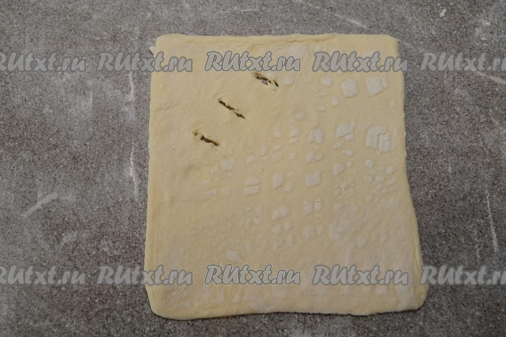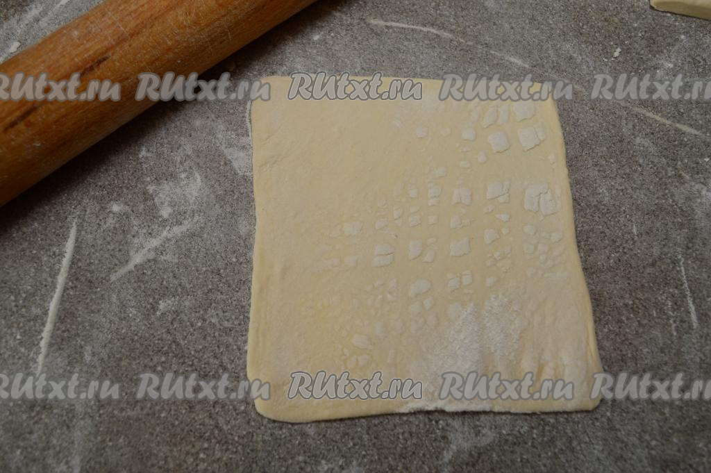 Разрезать размороженный пласт слоёного теста на 4 одинаковых квадрата.