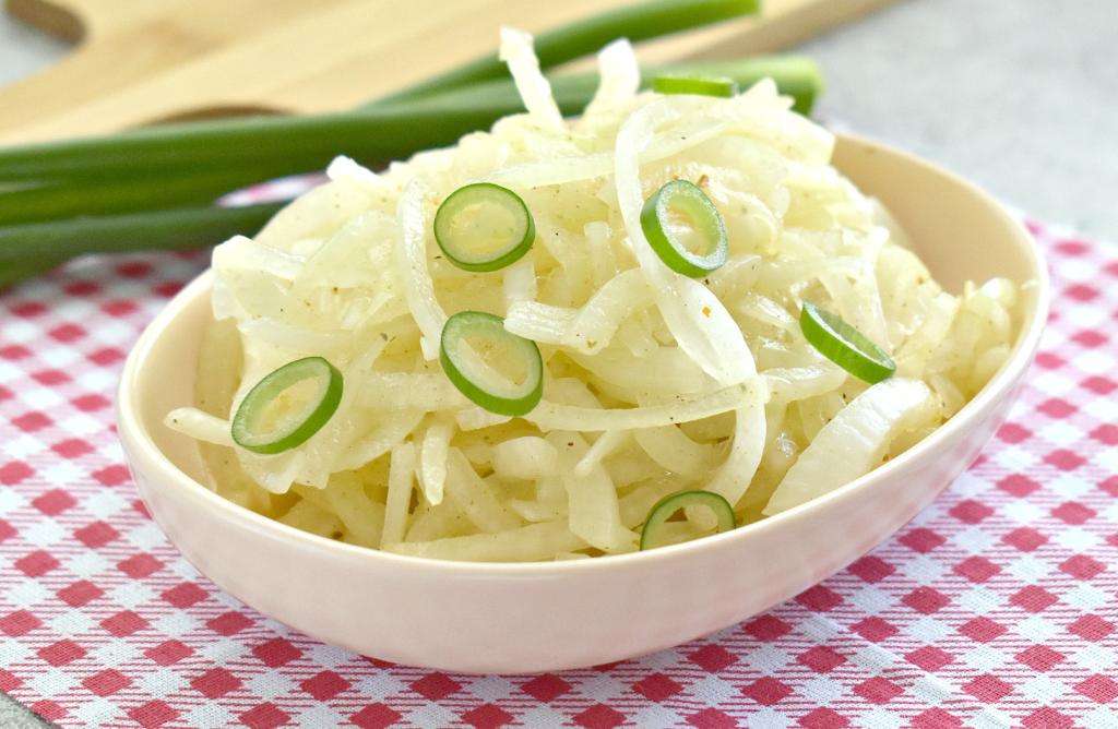 Лук, маринованный с яблочным уксусом, получается сочным, с пикантным вкусом, он станет отличным дополнением к шашлыку из мяса или курицы.