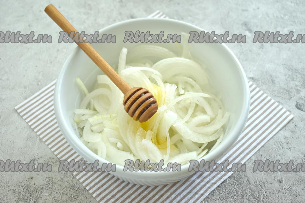 Очищаем репчатый лук и нарезаем его на полукольца.