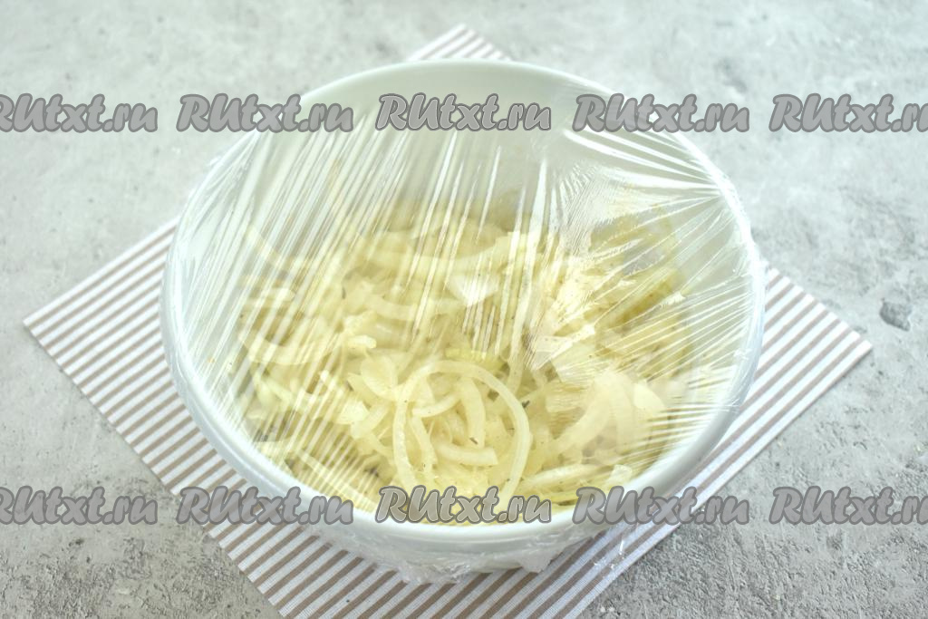 Миску с луком затягиваем пищевой плёнкой и отправляем в холодильник для маринования примерно на 1 час.