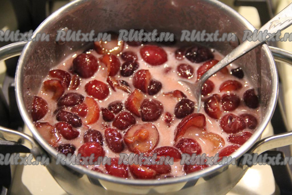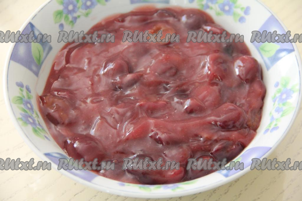 Как только начинка закипит, она начнёт густеть. Проварить её 2-3 минуты на небольшом огне, не прекращая помешивать, затем снять с огня, переложить на тарелку и дать начинке из черешни полностью остыть.