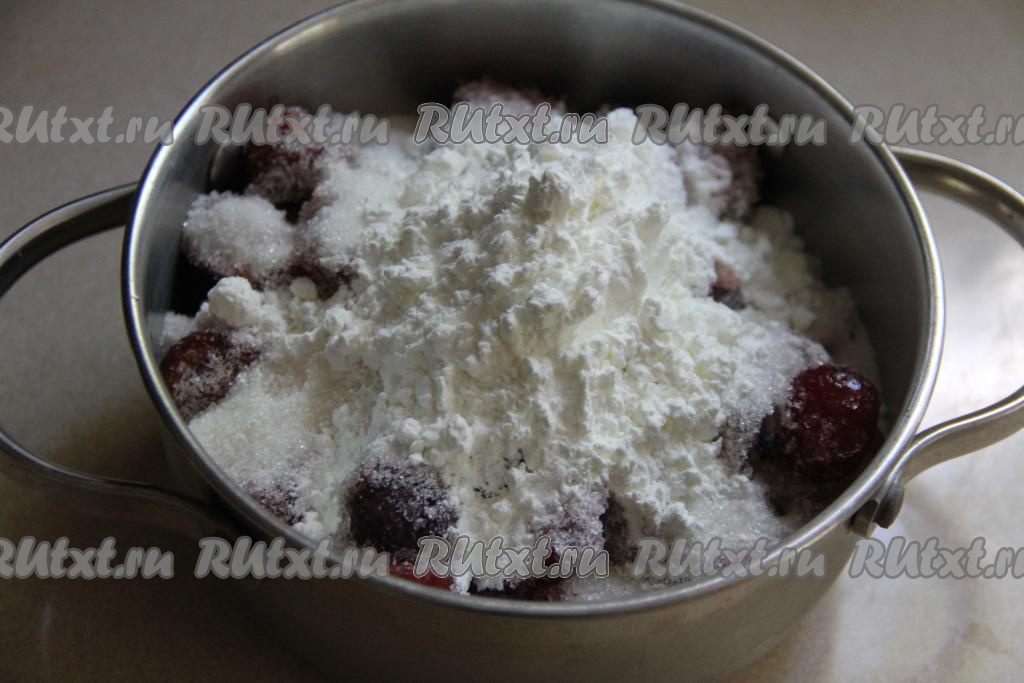 В кастрюлю с черешней добавить сахар и крахмал.