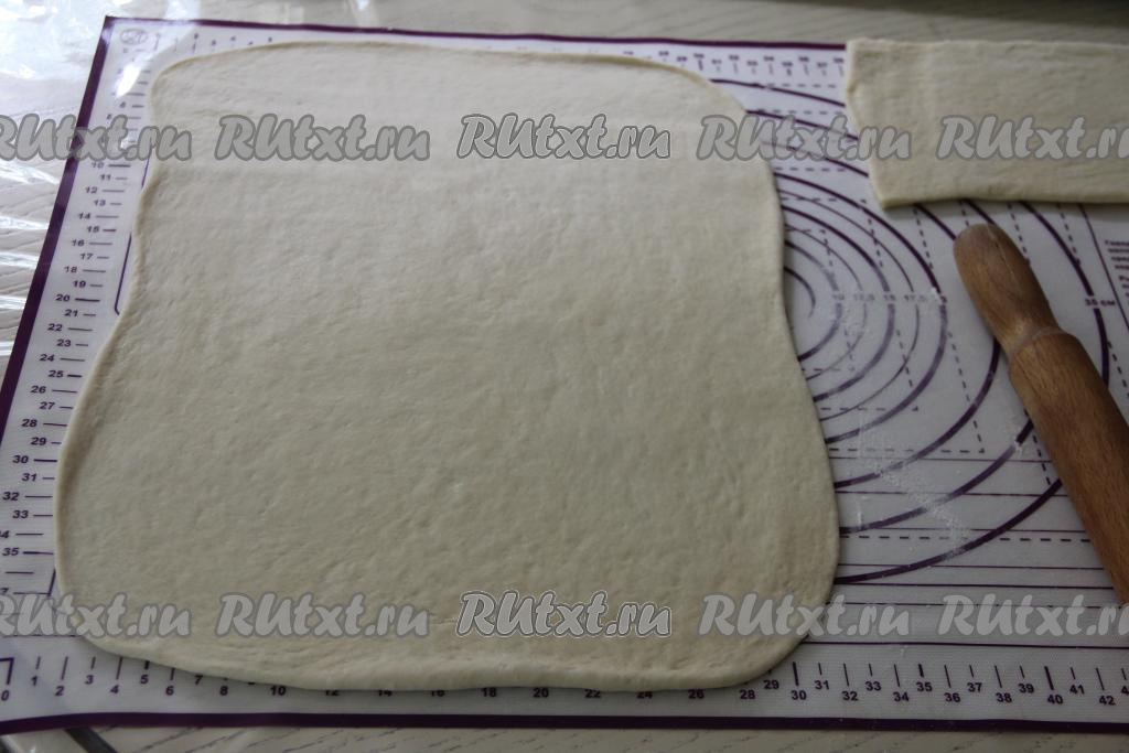 Самый большой кусок теста на присыпанной мукой поверхности раскатать в прямоугольный пласт толщиной 2-3 миллиметра и переложить на противень, застеленный пергаментом (или ковриком для выпечки).
