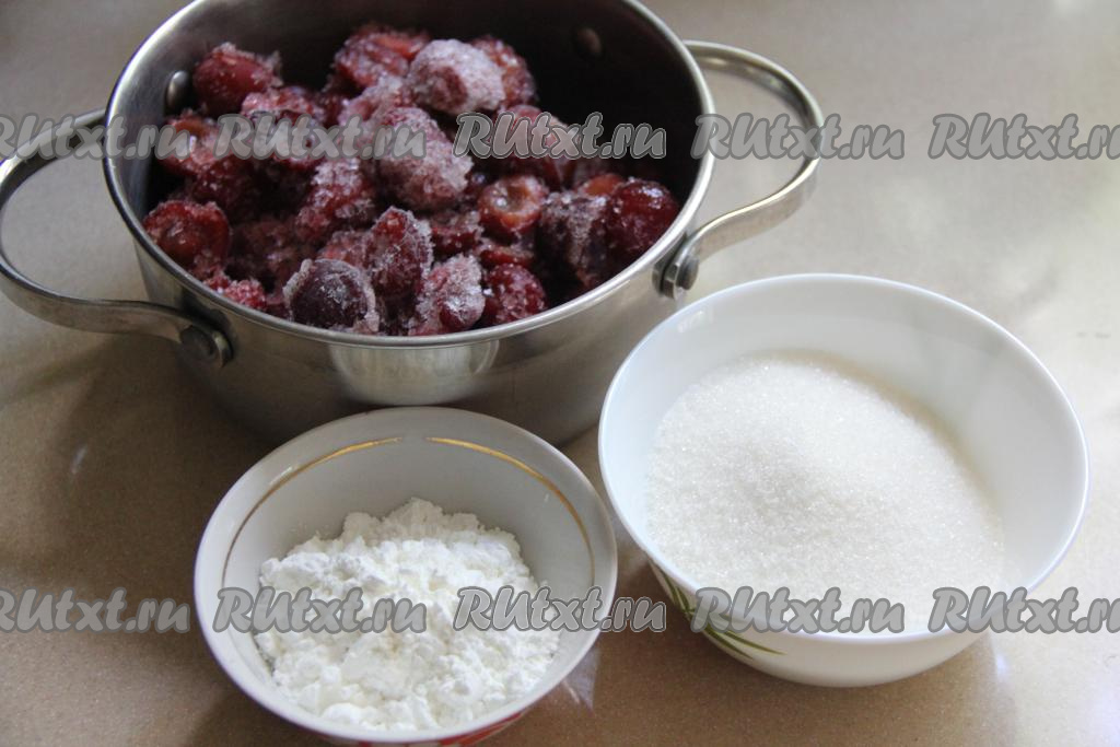Пока тесто поднимается, приготовим начинку. Для этого в кастрюлю нужно выложить ягоды черешни без косточек. У меня замороженные ягоды без косточек, их можно не размораживать. Если у вас свежая черешня, тогда промойте ягоды и удалите косточки.