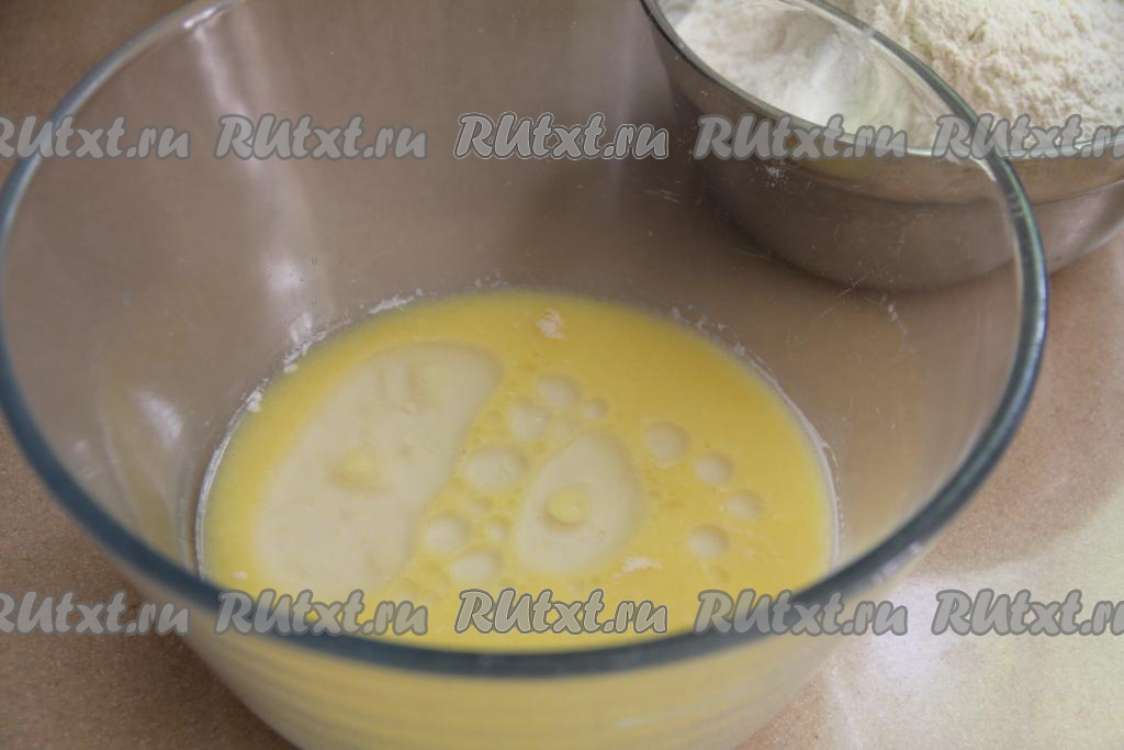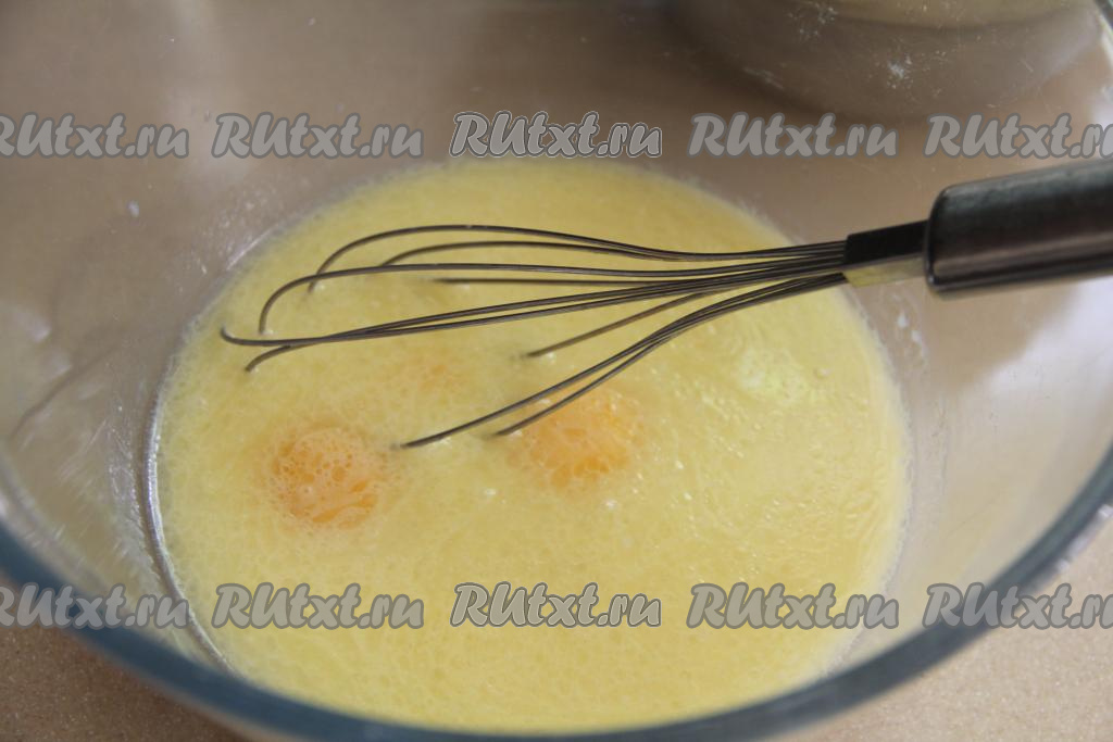 В миску с опарой и маслом вбить сырые яйца, всыпать соль, перемешать массу венчиком до однородности.