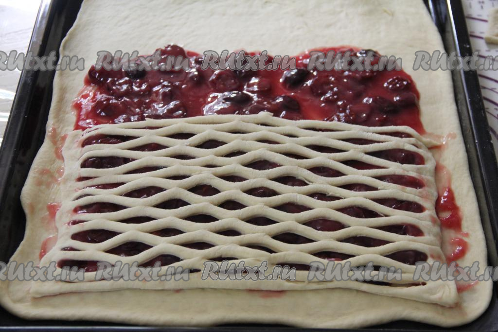 Кусочек теста, который был средним по величине, тоже раскатать в прямоугольник толщиной 2-3 миллиметра, сделать на тесте решётку специальным ножом. Если нет специального ножа, то можно сделать надрезы острым ножом в шахматном порядке. Выложить тесто поверх начинки ближе к узкому краю с начинкой.