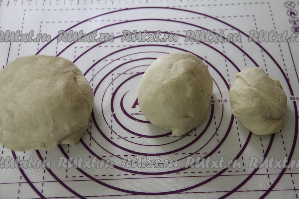 Обмять тесто и разделить на два равных куска. Один кусок отложить в сторону. А второй кусок поделить ещё на два неравных кусочка: меньший примерно 1/3 часть теста и больший - 2/3 теста. В результате у нас получатся 3 кусочка теста, как на фото.