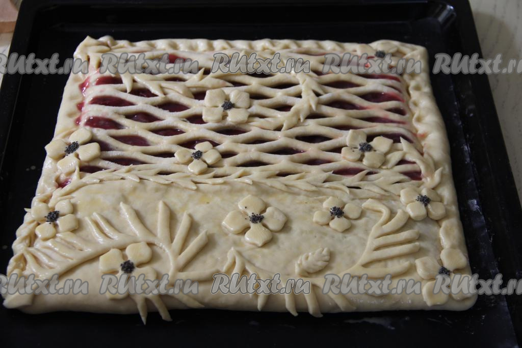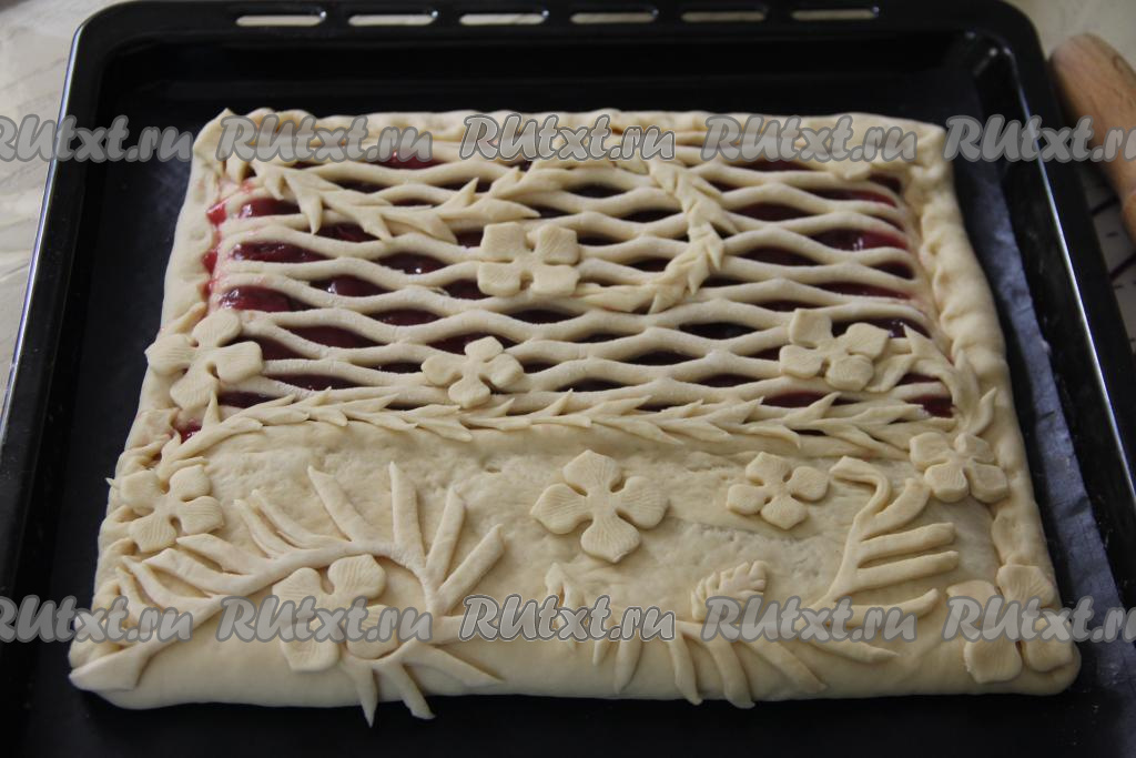 Свободным краем теста (краем теста, который мы оставили чистым) накрыть оставшуюся начинку. Защипать все края теста. Из оставшегося кусочка теста сформировать узоры и выложить поверх пирога. Оставить пирог для расстойки на 25 минут.