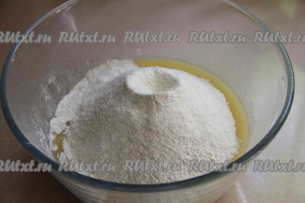 Всыпать грамм 300 просеянной муки, перемешать тесто столовой ложкой.