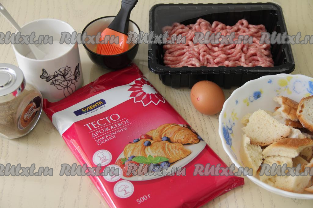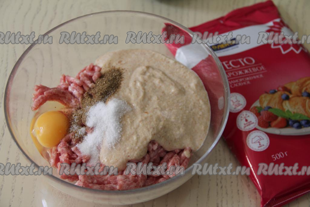 Подготовить продукты. Для этого блюда можно использовать слоёное бездрожжевое или дрожжевое тесто. Достать из морозилки слоёное тесто, пусть оно размораживается при комнатной температуре. Хлеб замочить в молоке. Мясной фарш можно использовать покупной, а можно пропустить кусочки мяса через мясорубку.