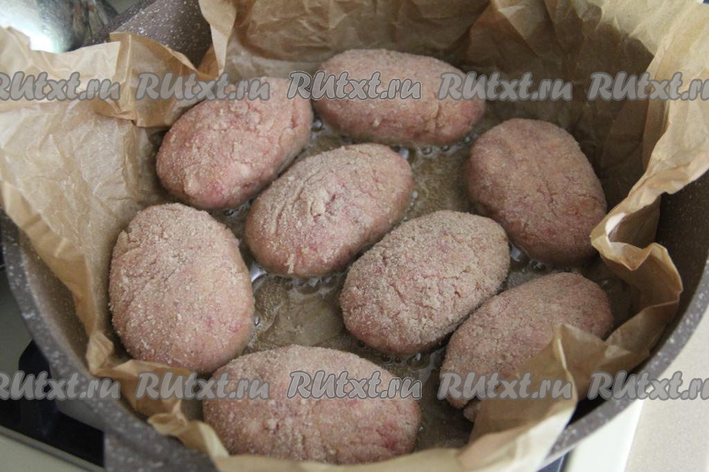 Котлетный фарш разделить на 8 равных частей. Сформировать котлеты овальной формы и обвалять их со всех сторон в панировочных сухарях (или в муке).