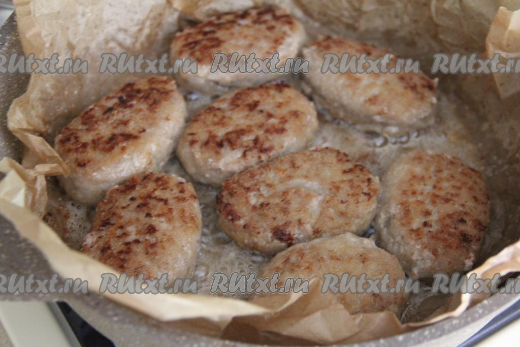 Котлеты можно, как обычно, выложить на сковороду с хорошо разогревшимся растительным маслом. Я решила пожарить котлеты на сковороде, застеленной пергаментом для выпечки. Для этого в сковороду выложить пергамент, добавить немного растительного масла. Поставить сковороду на огонь и выложить котлеты на пергамент.