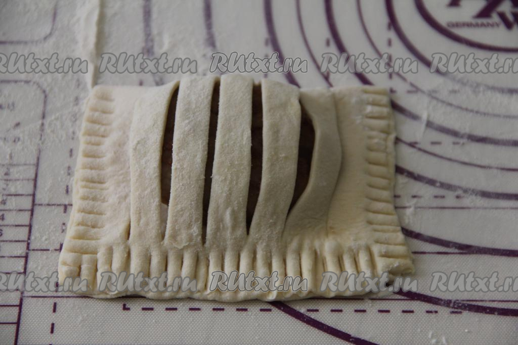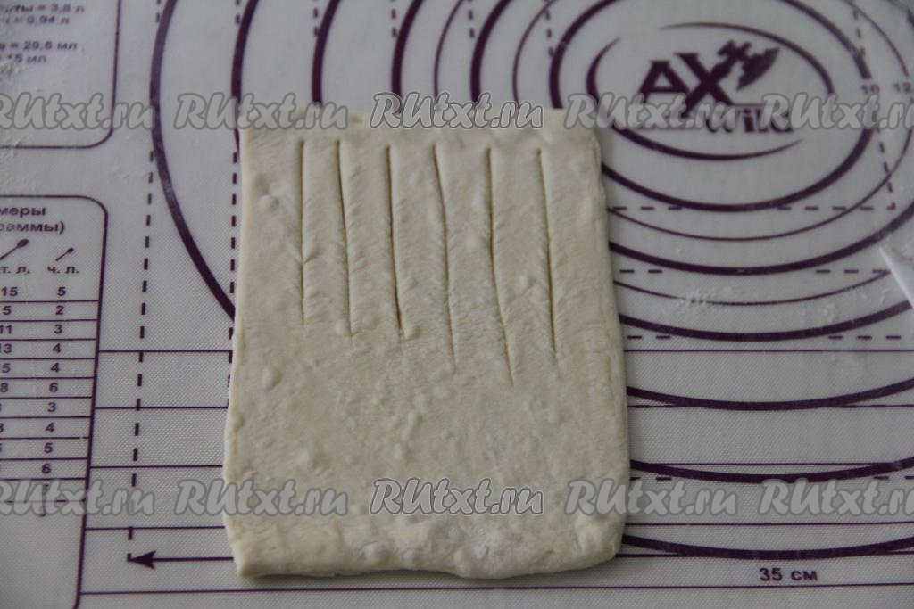 Каждый квадратик теста на припылённой мукой поверхности раскатать в длинный прямоугольник толщиной 2-3 миллиметра. Сделать надрезы острым ножом на одной узкой половине прямоугольника, как на фото.