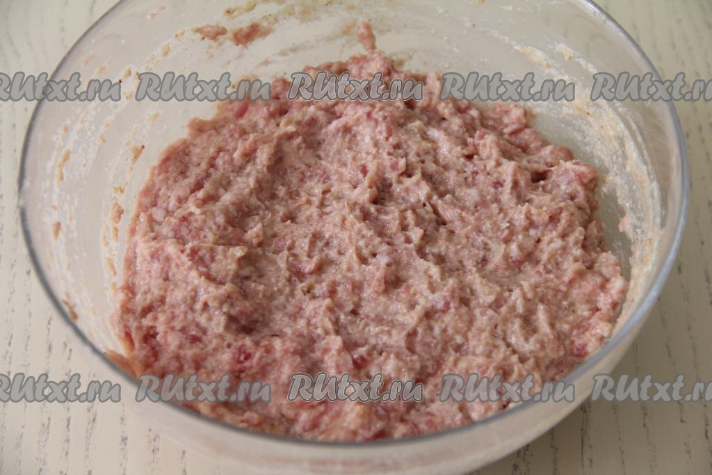 Хлеб, замоченный в молоке, измельчить в измельчителе (или пропустить через мясорубку). Фарш выложить в объёмную миску, добавить измельчённый хлеб, сырое яйцо, соль и специи.