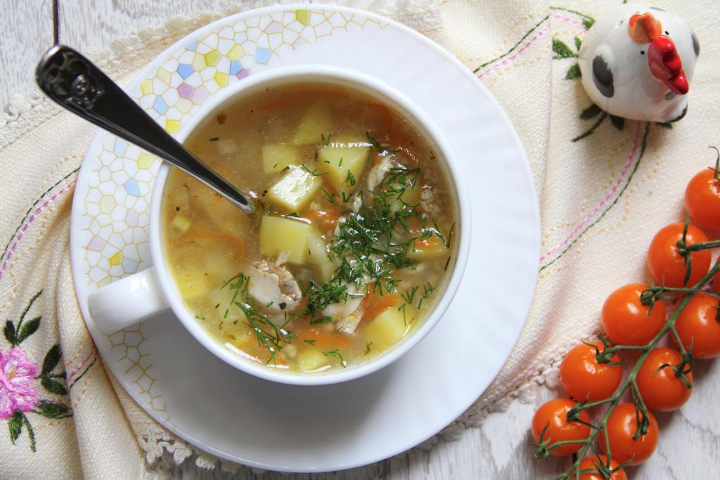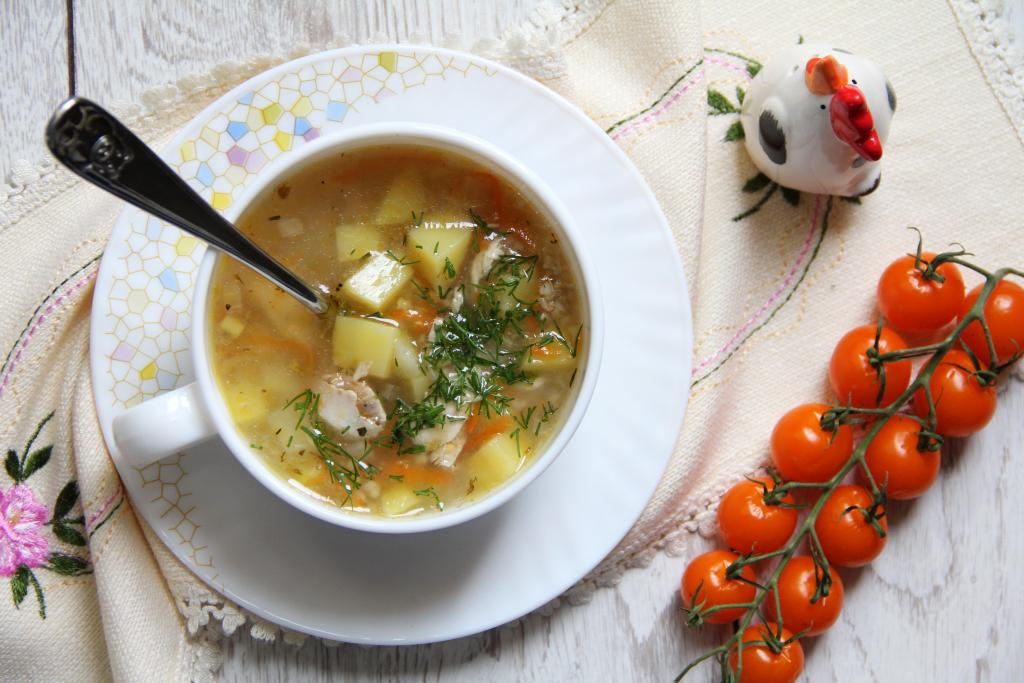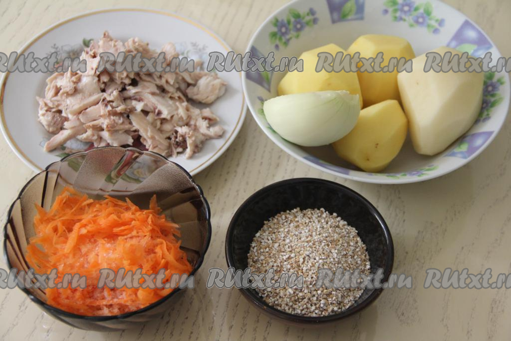 Затем достать сварившуюся курицу из бульона, дать остыть, после этого отделить мясо от костей, нарезать на кусочки. Бульон, если нужно, процедить, сразу вернуть его в кастрюлю. Картошку почистить, залить полностью водой, чтобы картофель не почернел. Ячневую крупу хорошо промыть водой. Лук и морковь почистить.
