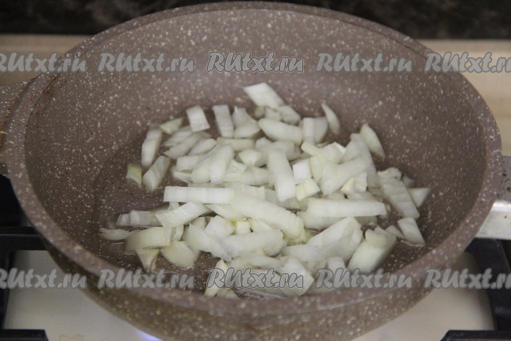 Пока варится суп, обжарим овощи. Для этого в сковороду с разогретым растительным маслом нужно выложить мелко нарезанный лук.