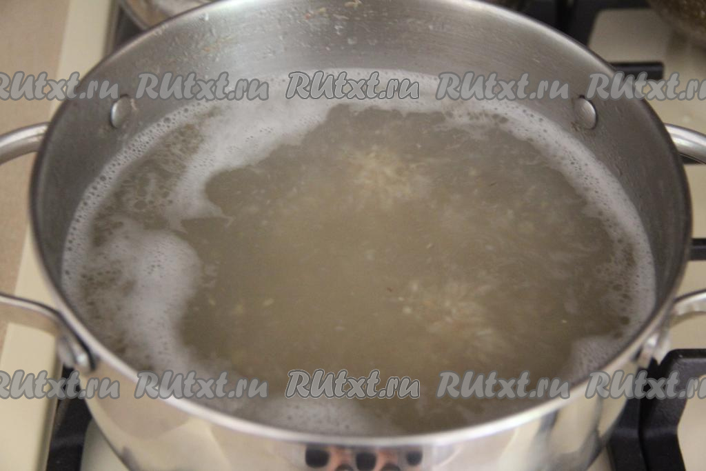 Кастрюлю с бульоном поставить на огонь, сразу добавить подготовленную ячневую крупу, перемешать и варить с момента закипания на небольшом огне 15 минут.
