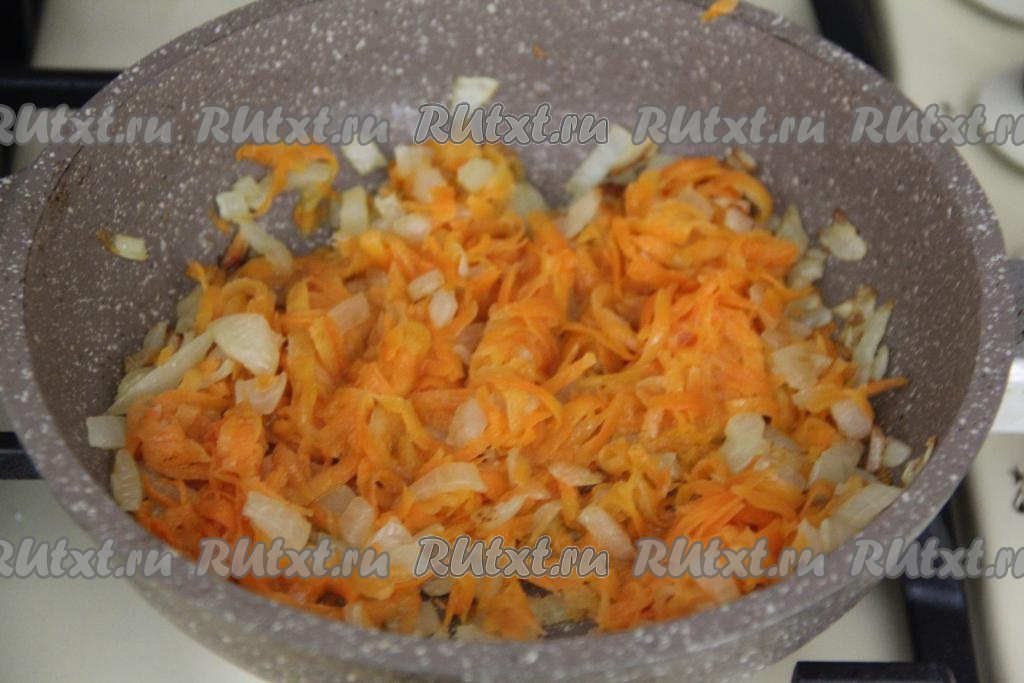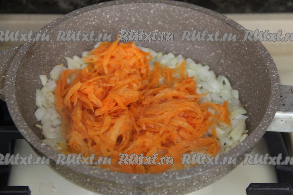 Обжарить лук на среднем огне до прозрачности (в течение 4-5 минут), иногда перемешивая, затем выложить морковку, натёртую на крупной тёрке, перемешать.