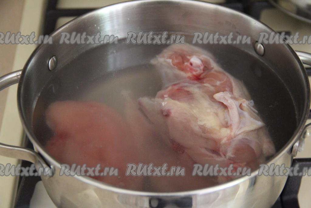 Вымытые части курицы переложить в кастрюлю, влить 2 литра воды и поставить на огонь, после закипания, убрав пену, варить бульон минут 40-45 на небольшом огне.