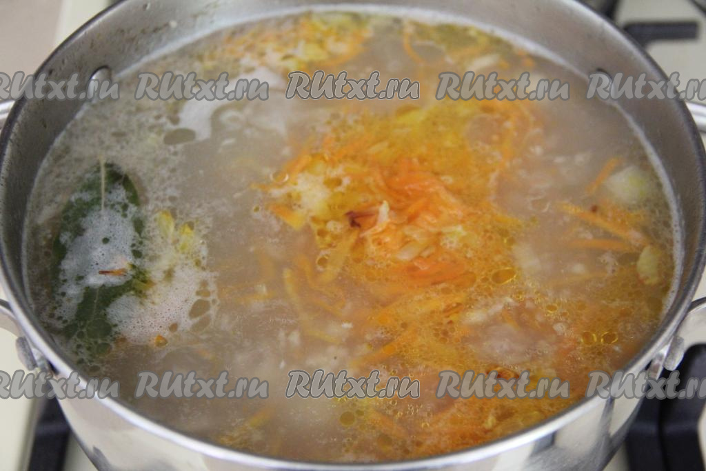 После того как картошка проварится с момента закипания 15 минут (станет достаточно мягкой), добавить в суп обжаренные овощи, лавровый лист и соль, дать закипеть и варить на небольшом огне 5 минут.