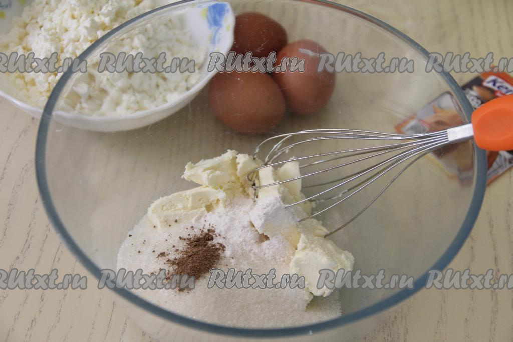 Выложить творог и перемешать.